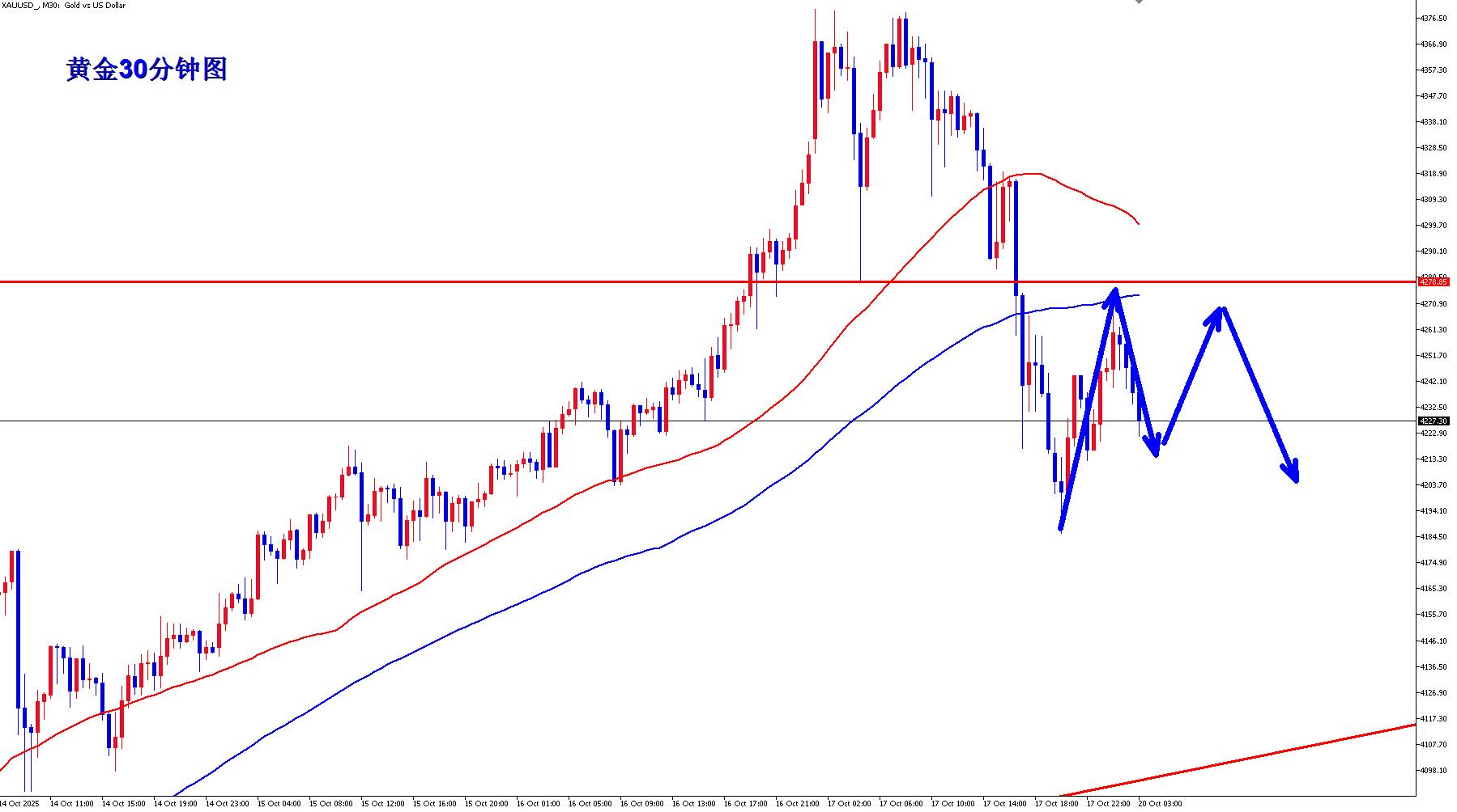 The 30-minute moving average of gold has begun to turn downward. If the 30-minute moving average of gold forms a dead cross downward, then there is still room for downward adjustment in the 30-minute adjustment of gold. Even if gold is hedging in early trading, it still cannot break through the resistance of 4280, indicating that gold 4280 is still the current watershed between long and short. The rebound in early trading is under pressure and 4280 continues to rise high.