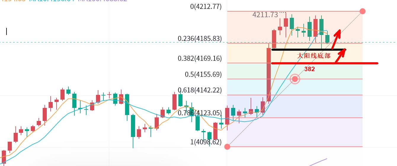 2. It is rising and retracing three key support levels: the retracement of the increase to the 382 position, the early morning correction low, and the hourly Yang line low, and this position is just at 4180.