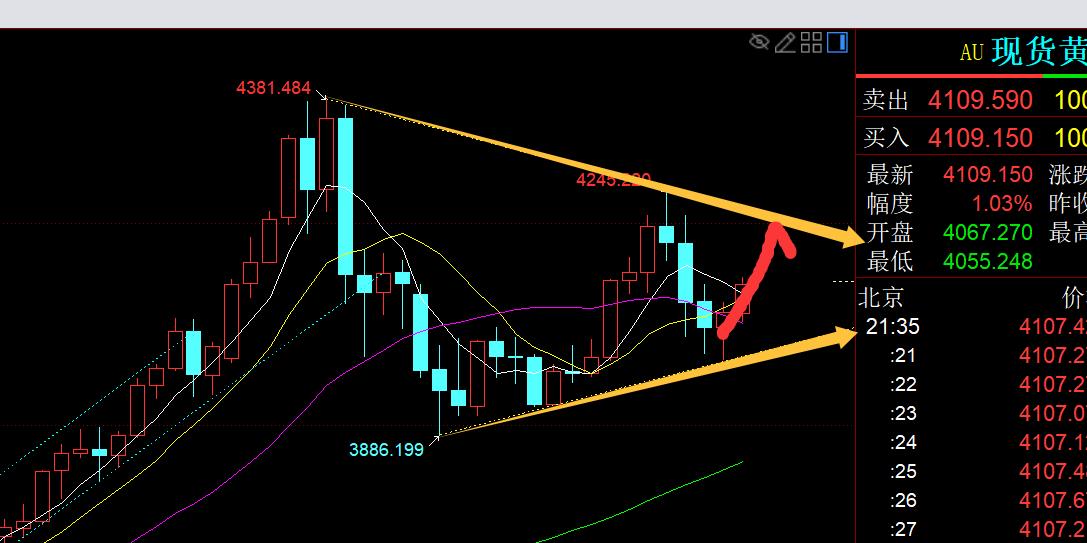 First, the gold daily level: Yesterday, it closed at a good bottom-turning K, and the low point also held the lower track of the small convergence triangle in the chart. Then in the next few days, we will test the upper track (correspond to it here, because it is a variable as time goes on), or at least test 4245-399 7 The 618 division that has fallen in the past few days is about 4150;