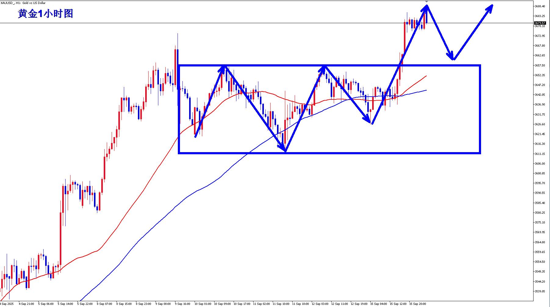 黄金1小时均线已经形成金叉向上的多头排列,黄金向上空间进一步打开,黄金不断刷新高点,低点也不断抬高,很明显还是多头趋势,黄金当前关注突破箱体震荡之后回踩箱体的支撑,短线支撑大3658一线,黄金回踩3658上都是逢低做多的机会。
