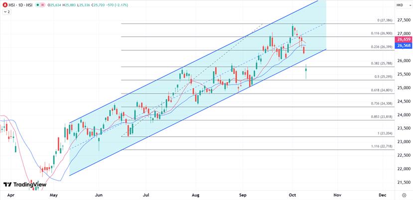 随着贸易局势再次紧张,港股今早再次经历恐慌,波幅指数飙升近29%,创2025年5月以来新高。短线大跌后市场可能会回复些许观望中的平静,等待两国潜在的磋商,不过港股在跌至逾一个月最低后,下破了上行通道,短线下行压力依旧,守住25000关口是重启反弹的关键。