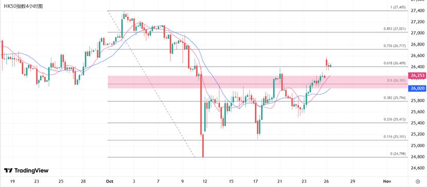 XM Hong Kong Stocks: China und die Vereinigten Staaten haben erste Gespräche über Handel und andere Themen geführt. Dem Konsens zufolge verbessert sich die Marktstimmung. Der Hang Seng Index setzte seinen Aufwärtstrend fort, nachdem er letzte Woche die Marke von 26.000 überschritten hatte. Er eröffnete heute Morgen mit 335 Punkten oder 1,28 % höher, stieg innerhalb eines halben Tages um 267 Punkte und schloss bei 26.427. Am Nachmittag konnte die Steigerung um mehr als 200 Punkte gehalten werden. Der Staatsunternehmensindex stieg innerhalb eines halben Tages um 0,95 % auf 9.452 Punkte, und der Hang Seng Technology Index stieg um 1,48 % auf 6.149 Punkte.