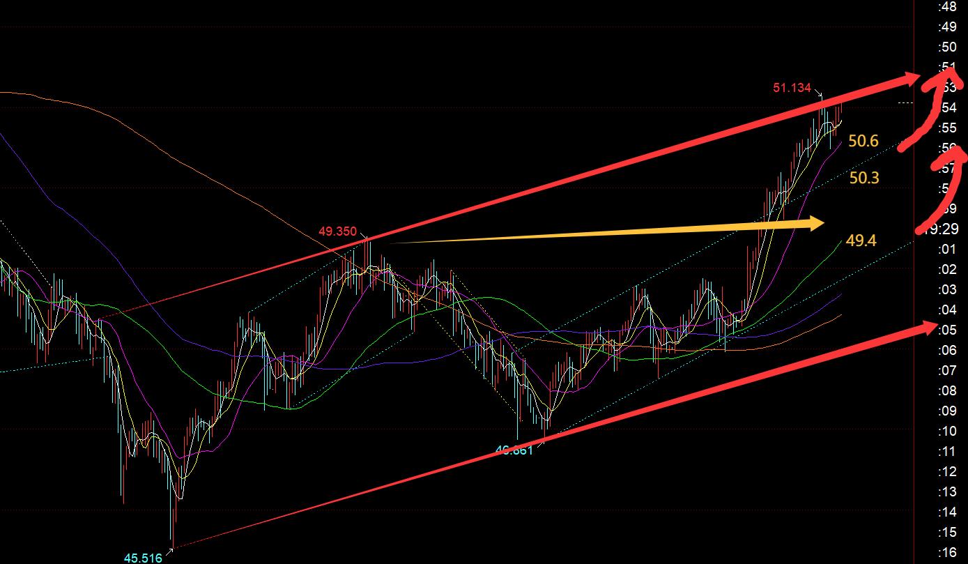 Silber: Gestern schloss es auch mit einer starken Sonne und durchbrach effektiv das seitwärts gerichtete Druckniveau von 49,4-49,5 im vorherigen aufsteigenden Dreieck. Dann wird es zu einer effektiven oberen und unteren Unterstützung für die Marktaussichten und wird dies auch weiterhin tun aufstehen; Heute ist es auf die 51-Linie gestiegen und hat die 618-Division, den zweiten Höchststand, früher als Gold erreicht. Dies impliziert von der Seite, dass Silber stärker ist als Gold, oder dass es noch mehr Raum für Verbesserungen gibt, was auf die nächste Division von 52,5 hinweist. Aus dem Bild oben geht hervor, dass auch der asiatische Markt weiter stieg, stieg und fiel am Nachmittag, stabilisierte die Stundenlinie und erreichte die Talsohle und steht kurz davor, das Intraday-Hoch zu testen. Auf diese Weise ist der Trend des europäischen Marktes immer noch stark und es wird heute Abend einen zweiten Anstieg geben, der heute Abend offensichtlich bullischer ist als Gold; nach 50,6-50,8 heute AbendBleiben Sie weiterhin optimistisch. Nachdem Sie 51,1 durchbrochen haben, bewegen Sie sich allmählich in Richtung 52-52,5; das heißt, sobald es durchbricht und die obere Spur des roten Kanals erreicht, wird es den Aufwärtsraum weiter öffnen;