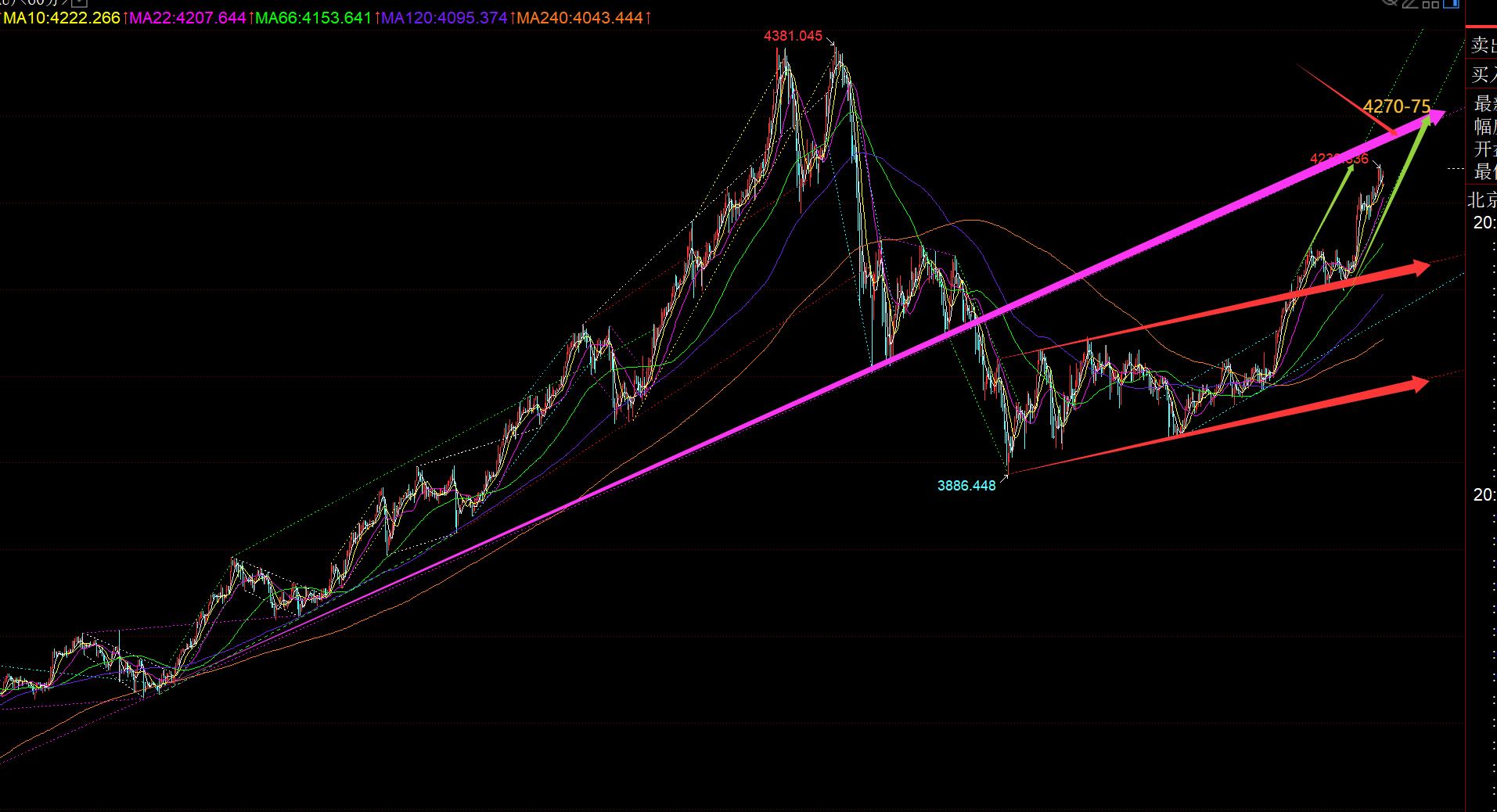 Erstens das Gold-Tagesniveau: Gestern schloss es weiterhin bei positivem K, heute nicht mitgezählt, es waren vier aufeinanderfolgende positive Tage, und in der Mitte gab es keinen Druck.Die Korrektur ist negativ, daher soll diese Welle in einem Zug einseitig nach oben gehen. In den letzten zwei Wochen wurde betont, dass zumindest der zweite Höchstpunkt bei 4192 getestet wird, der zur 618-Divisionsposition von 4381-3886 gehört. Es war gestern Abend direkt an Ort und Stelle und hielt überhaupt keinem Druck stand. Es ging direkt rüber, dann ist als nächstes die 786-Division Position 4275 zu testen; Beziehen Sie sich auf die Erholung des zweiten Höhepunkts nach der Unterdrückung von 3500 im April. Zu diesem Zeitpunkt stand 786 zufällig unter Druck, und für einen bestimmten Zeitraum entfaltete sich ein großes Konvergenzdreieck. Es muss beobachtet werden, ob es sich dieses Mal wiederholt.