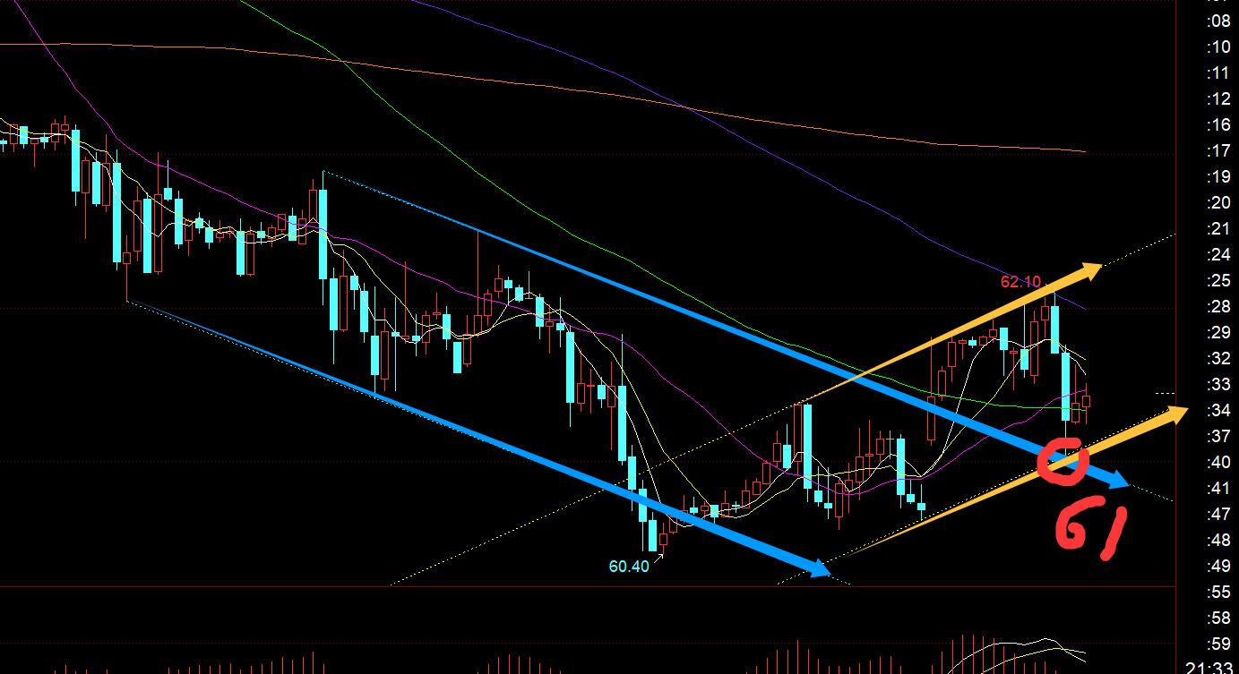Crude oil: the gap opened high in the morning to pull up, but the European session did not continue to pull up, so we need to continue to observe tonight; from the channel distribution in the figure, the 61 line belongs to the resonance support point of the two channels, to see if it can keep stable above this position tonight, and then consider watching a wave of oversold rebound; if it cannot hold on to 61, then it must fill the gap, and then stabilize above 60 and wait for the stabilization pattern;