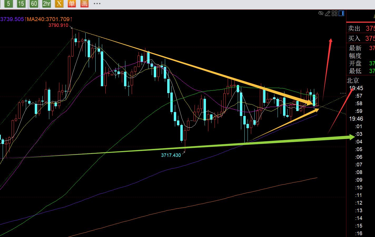 segundo, nivel de 4 horas de oro: desde el punto de desarrollo actual de este ciclo, la vía media ha estado bajo presión muchas veces, y esta noche es el momento de probar sus cañas y pérdidas; Mientras la K positiva esté cerrada a las 22 en punto, la posición de cierre estará en la pista central en 3754, básicamente continuará atacando y alcanzó un alto histórico;