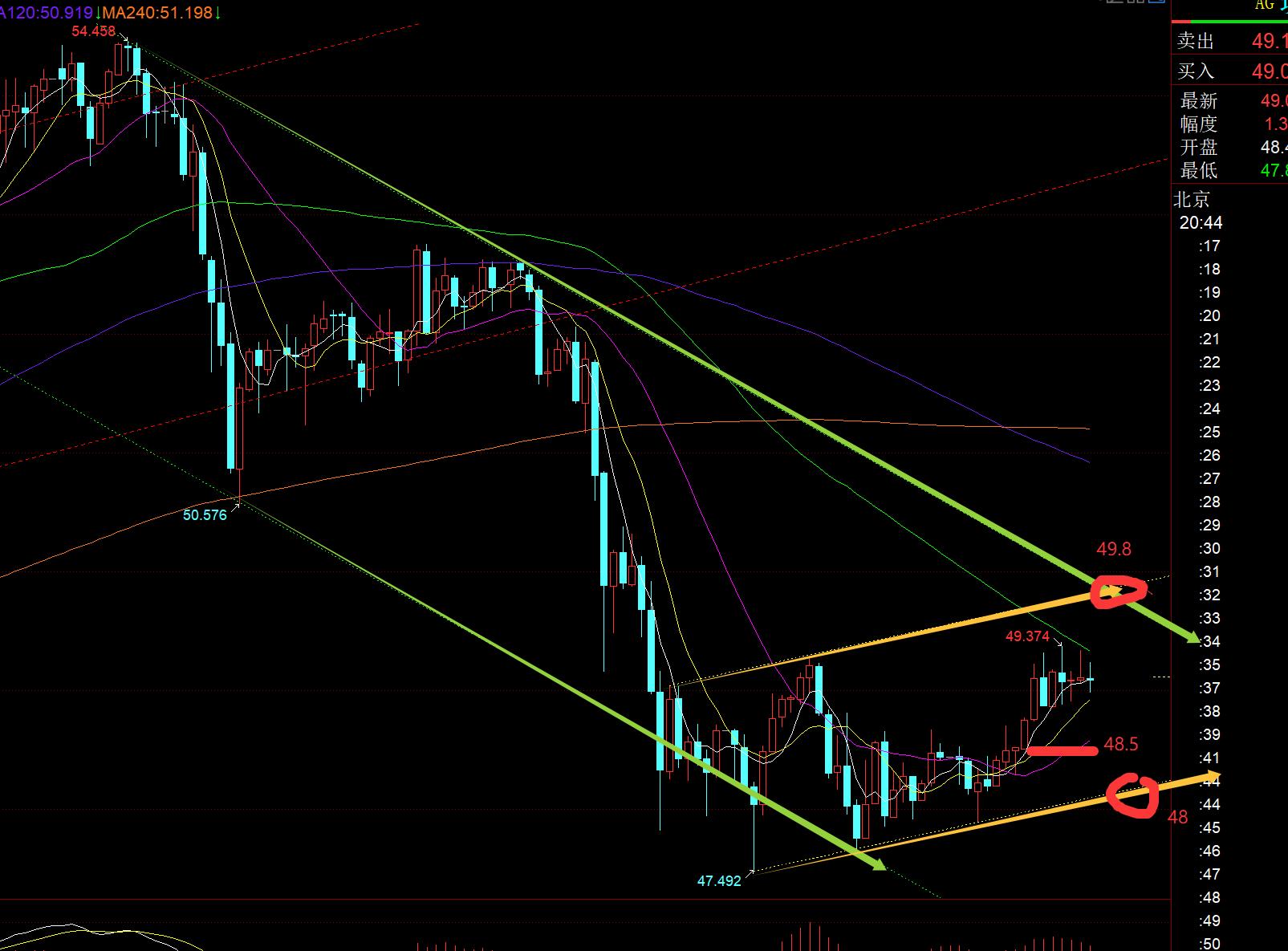 Lo mismo ocurre con la plata. Está en la forma embrionaria de consolidación del fondo. Desde la perspectiva del canal, la presión clave arriba es 49,8, el soporte clave abajo es 48 y el eje central es 48,5. Trátelo con shock y luego espere a que llegue la señal; si supera 49,8, también aparecerá el fondo a corto plazo y las perspectivas del mercado aumentarán gradualmente;