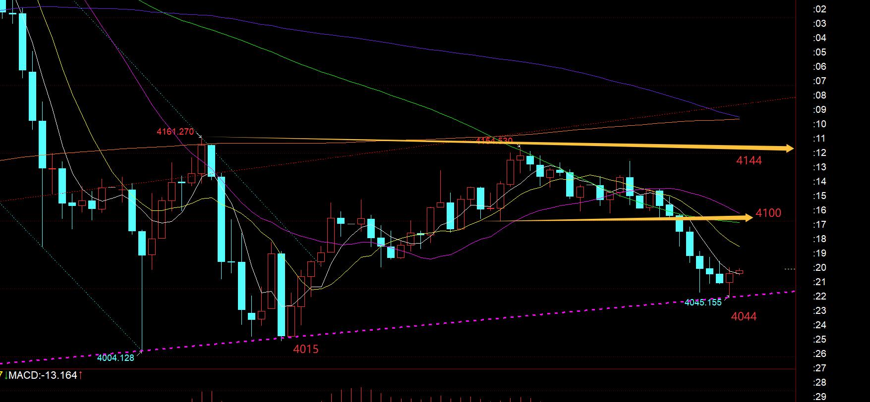 En segundo lugar, el promedio móvil semestral de oro de 4 horas y el promedio móvil de 66 días de 2 horas resuenan y respaldan la línea 4044, mire su ganancias y las pérdidas de esta noche, el 5 y 10 de 4 horas se concentraron en la línea 4100, y la ruptura de hoy aquí provocó una mayor caída; la resistencia en el carril medio bajó a 4133, y la resistencia en el día 66 bajó a 4156; para que este ciclo se fortalezca es necesario ir superando poco a poco estas posiciones de resistencia, el macd se ha estado gestando, y está esperando a que en cualquier momento aparezca la cruz dorada bajo el eje cero;