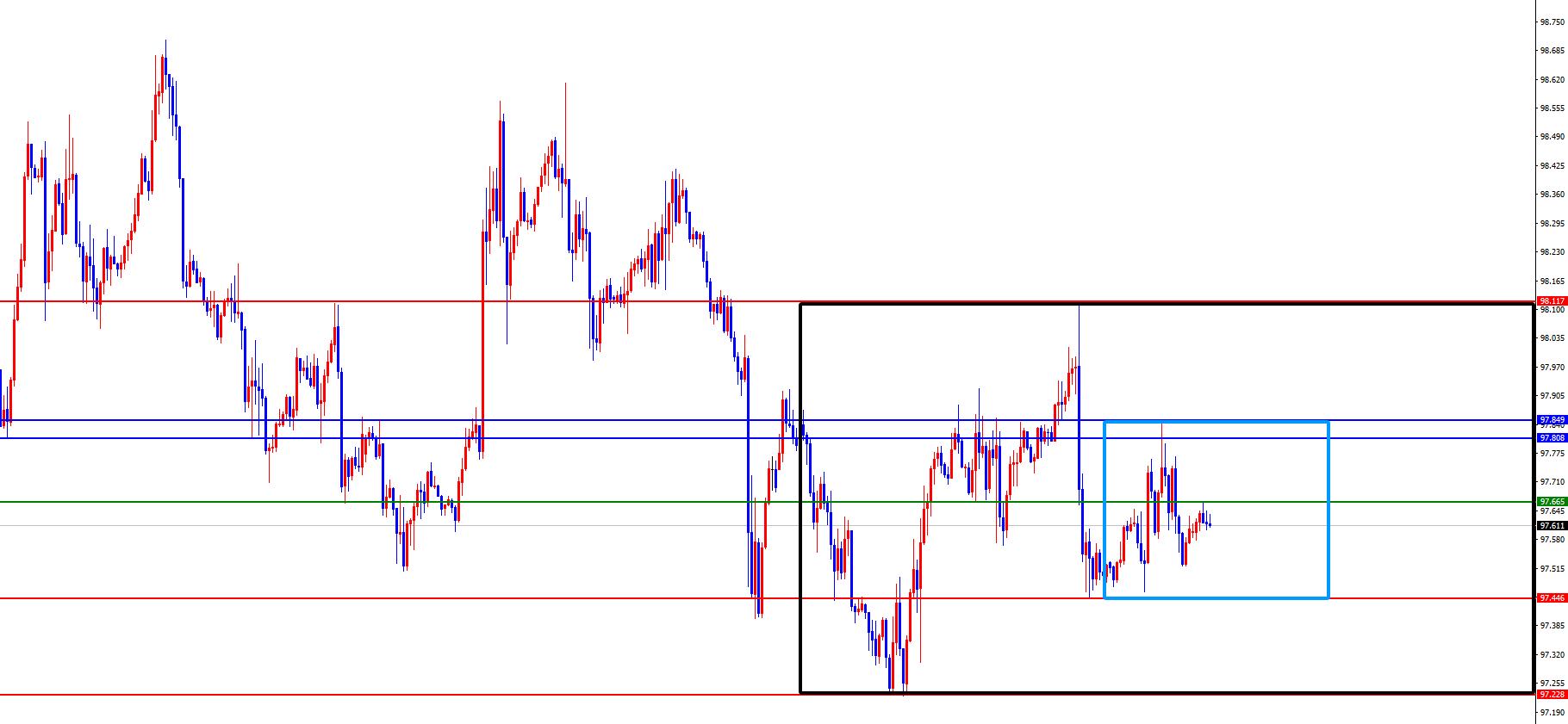 미국 지수 범위 97.25-98.10, 작은 범위는 97.45-97.85이고, 유역은 97.66