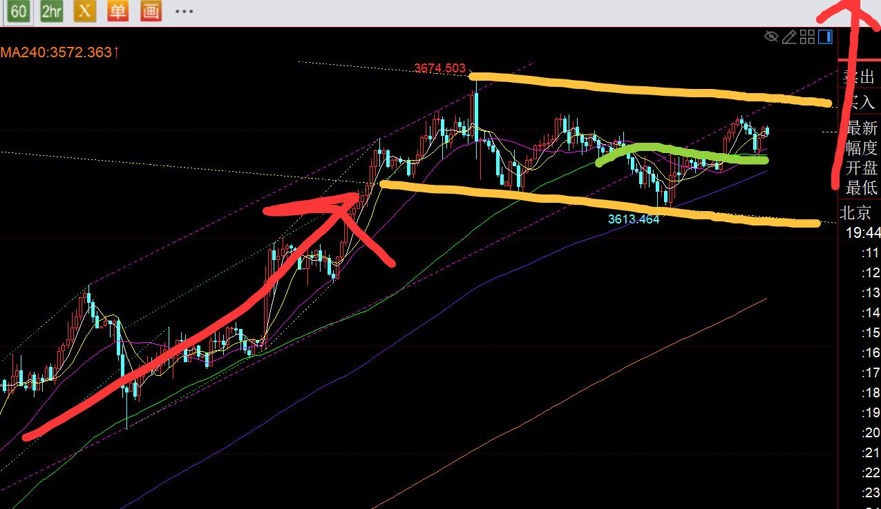 第三,黄金小时线级别:从图中通道分布来看,它暂时维持黄色平行通道内,不断震荡来回整理,走一个上升旗形,最终向上突破发力继续来单边;而中轨的得失是决定它能否提前上破的关键;若今晚守住中轨,继续逐步震荡上拉,突破黄色通道上轨的概率就会偏大;若今晚失守中轨,且失守3637欧盘低点,那么基本是黄色通道内震荡了,下周初就有可能还会试探通道下轨低位的可能,届时那个低位也应该会靠拢日线10均线位置,就是一个不错的低位看涨点,也会是一个小波段机会;今晚就多观察下,看3637之上能否守住,中轨能否守住,出现探底拉升K了,则再考虑3637之上逢低看涨;失守3637了,今夜就不要急着去看涨,等下周一调整到位至黄色通道下轨;上方阻力是3663-62一线上轨,突破站上它了,才能走上升旗形的单边拉升概率;