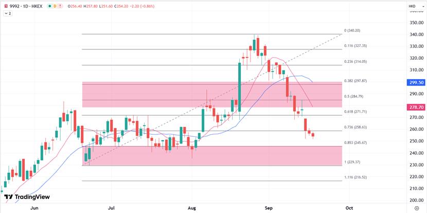 自8月26日创出339.8港元/股的历史高点后,泡泡玛特股价持续阴跌,截至今日收盘较最高点已经跌去23.78%,市值蒸发超千亿港元,而同期恒指上涨了2.16%。综合来看,泡泡玛特目前处于短期高估值调整与长期成长逻辑并存的局面,短期确实需要消化前期过大涨幅,因此需要等待更多催化剂反弹。应注意股价波动可能较大,当前股价经过连续调整后,分别聚焦技术上6月底和8月初的低位是否能再次提供关键的支撑,捍卫220港元后重新寻机反弹;阻力方面分别落在日图均线的280至300港元关口范围内。