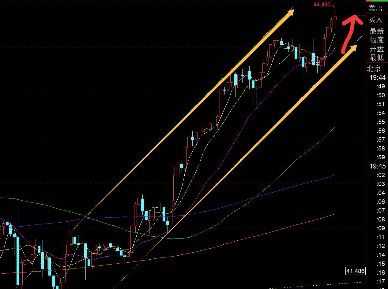 第二,白银方面:昨日早间开盘也是直接续涨单边持续发力,一直给不到回踩跟随看涨机会;美盘前后的一波回踩诱空给了不错的时机,虽回踩力度稍大了一点,刺破了欧盘起涨点,但守住了小时线关键中轨,也是618分割位置43.3,随后夜间发力,抵达44.1目标;