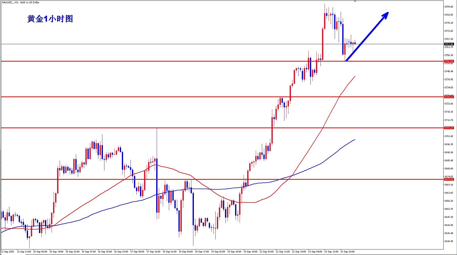 黄金1小时均线还是继续金叉向上的多头排列发散,黄金还有多头动能,黄金昨晚探底之后继续向上,那么黄金短线可能已经调整结束,黄金昨晚低点3752上就是继续逢低多的机会。早盘黄金稍有回落就还是继续开始向上,黄金多头可能随时开始继续发力。