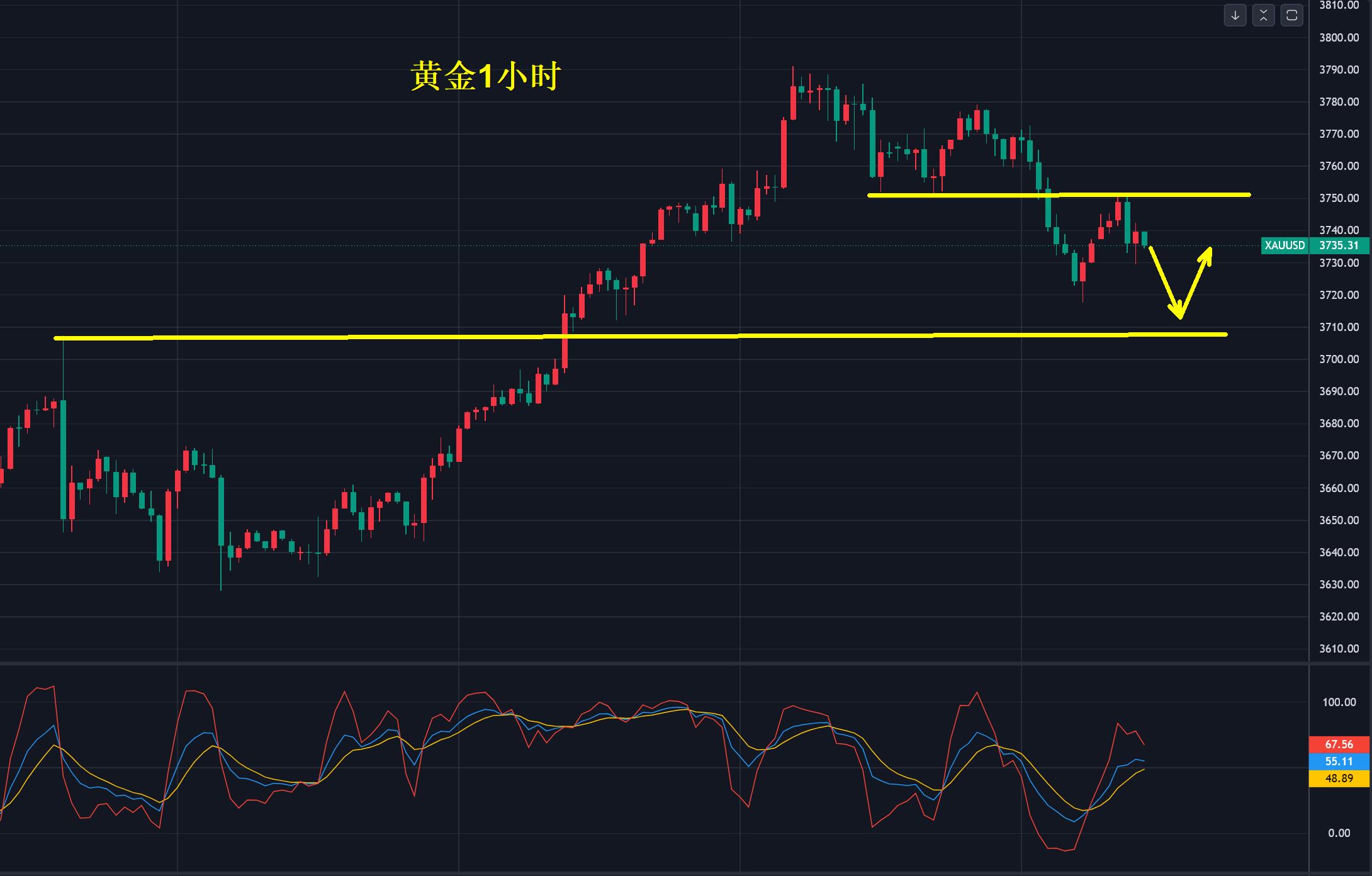 所以,有两个位置需要关注,压力在3750,支撑在3710,在这个区间内打破任意一个方向将会延续,涨了快400美元了,短期震荡很正常,要接受这种阶段性的修正。