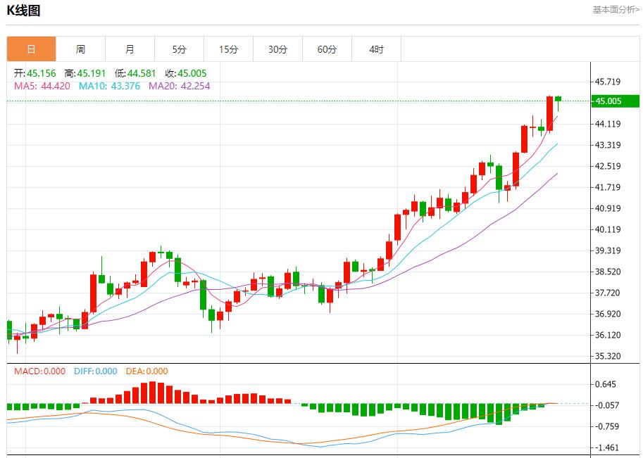 现货白银:截止北京时间20:23,现货白银下跌,现报45.001,跌幅0.34%。纽市盘前,尽管在相对强度指标上出现了负面信号,但在达到超买水平(表明积极势头的强度)后,白银价格在最后一个交易日上涨,在44.75美元的当前阻力位上方结算,以确认突破该阻力位为近期的新阻力位开辟了道路,在短期内主要看涨趋势占主导地位,并沿着该轨道的支撑趋势线交易。