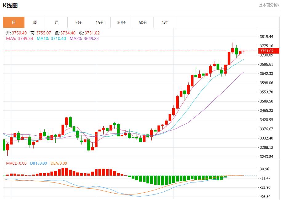 现货黄金:截止北京时间20:23,现货黄金上涨,现报3751.10,涨幅0.05%。纽市盘前,(黄金)价格在最后一个盘中交易中继续试图获得看涨势头,利用其在EMA50上方交易所代表的动态支撑,除了相对强度指标上出现积极信号之外,在其沿趋势线交易中,加强了短期主要看涨趋势的主导地位。