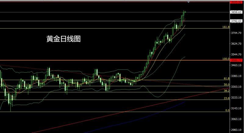 昨日黄金市场早盘开盘在3834.7的位置后行情回踩3824.9的位置后行情就开始拉升过程,日线最高触及到了3872的历史新高后行情盘中出现获利了结回落过程,日线最低给到了3792.3的位置后行情受到日线级别5日均线和基本面利多因素的共同作用行情完成V型反转,日线最终收线在了3858.4位置后日线以一根下影线极长的锤头形态收线,而这样的形态收尾后,今日的行情在技术上有一定的看多需求,点位上,下方3325和3322的多和上周3368-3370的多和3377和3385多和3563的多减仓后止损跟进在3650持有,今日先回落给出3832多止损3826,目标看3862和3872,破位的话看3885和3893和3902和3910附近。