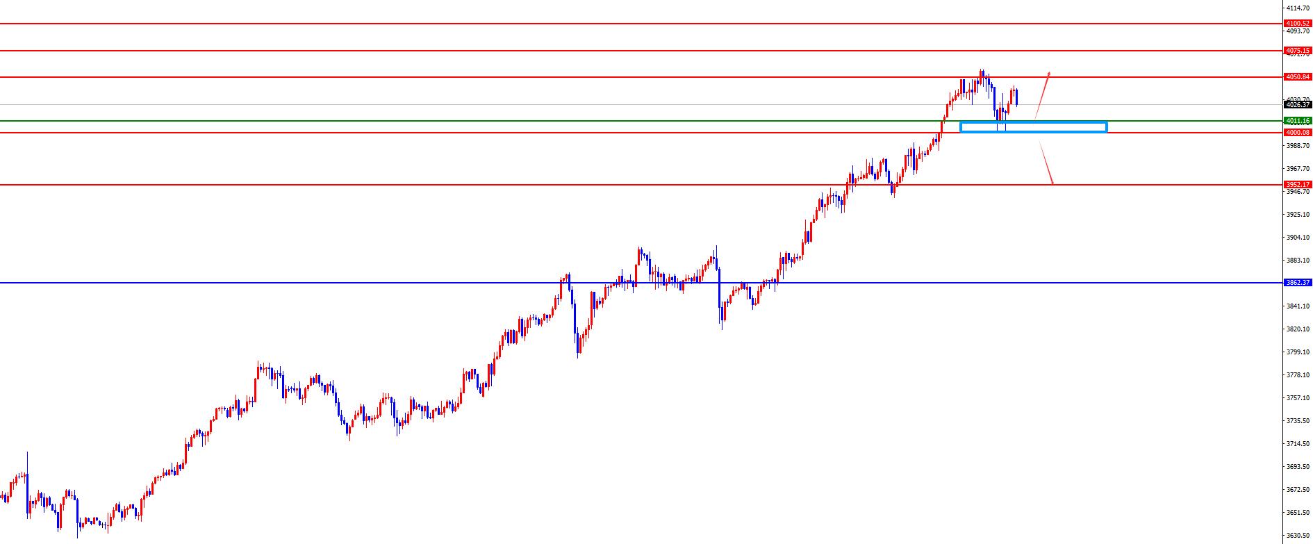 从多周期分析,首先观察月线节奏,从长线上看3130位置是长线走势的分水岭,价格在此位置之上长线多对待即可。从周线级别看,目前周线多空分水岭于3531位置,价格在此位置之上中线多对待即可。从日线级别看,暂时需要关注3862区域支撑,此位置之上波段多对待。从四小时上看,在今日早盘期间向下回撤刚好测试四小时支撑后止步上涨,所以此位置是短期走势的关键,随着时间的推移暂时关注4010-4011区间支撑,同时早盘低点为日内分水岭。一小时上看目前价格向下修正还没有结束,所以暂时关注欧盘市场节奏,美盘再布局,位置上重点关注早盘低点得失。