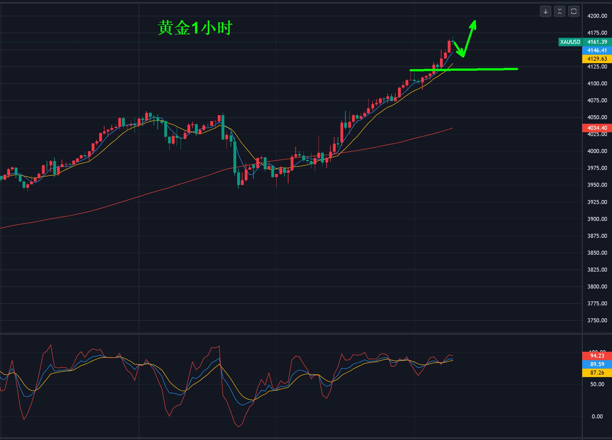 此次,中途金价自4060美元调整100美元,二次发力向上突破,目前已经刷新4160美元上方,调了100美元涨了200美元,距离4200美元越来越近,重点依托1小时5/10均线为支撑点。