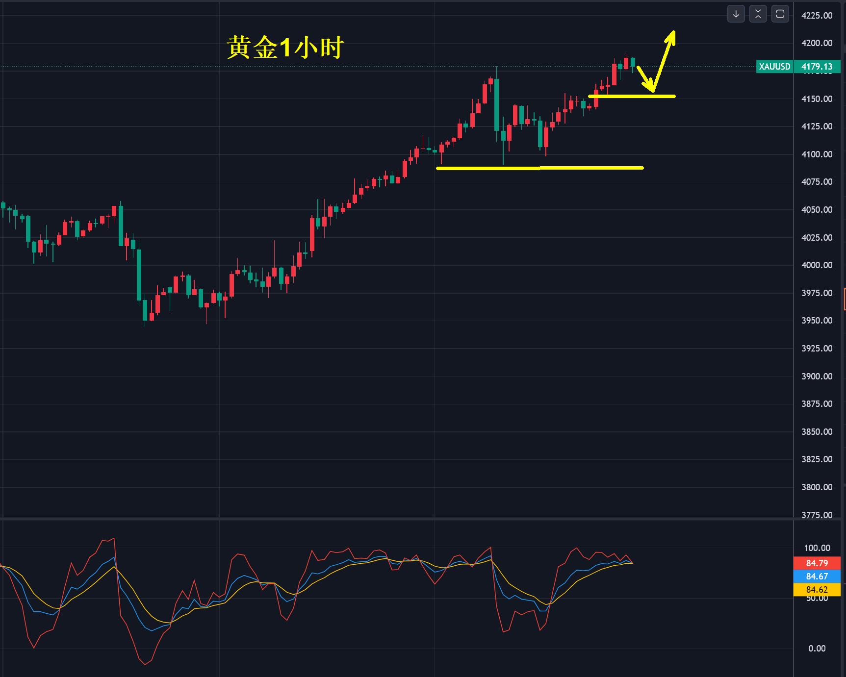 1小时,金价下探4090美元之后继续上攻,即将挑战4200美元,强势上涨过程中只有小幅回调,调整的幅度并不大,现在的黄金指标已经失灵了,所谓的形态过去历史上就没有出现过,更多的是共识和情绪的推动。