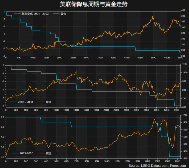 从2000年以来的三次降息周期中,金价均创下当时的历史新高,可见低利率对金价的刺激作用。