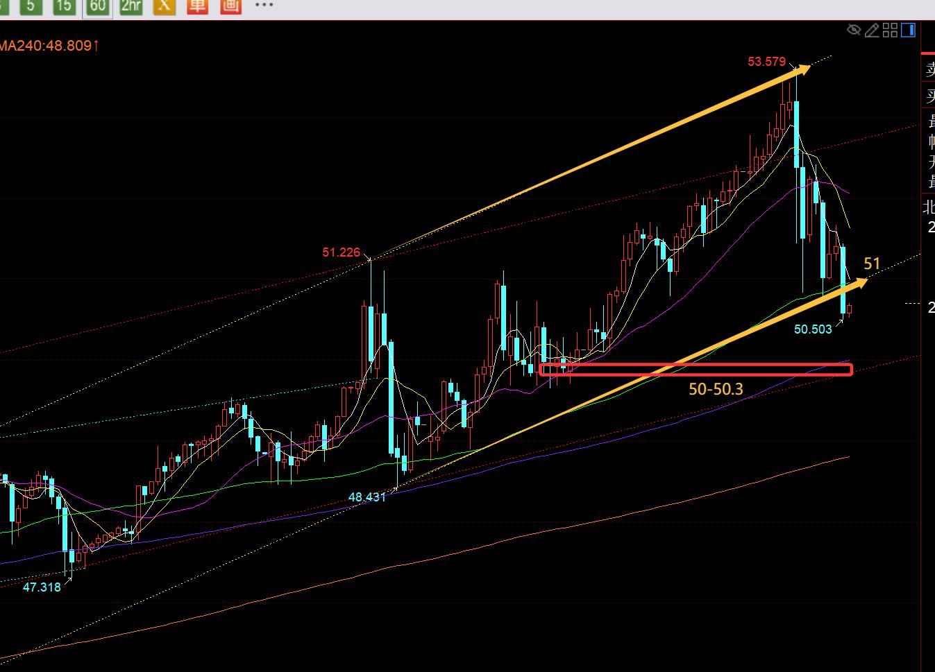 第二,白銀方面:早間先依托小時線中軌50支撐看漲,價格略差0.1,一波拉高至51.7,歐盤回踩50.5繼續看漲,價格剛好到位,美盤又是一波續漲,最高衝擊52.4一線,也是非常強勢;