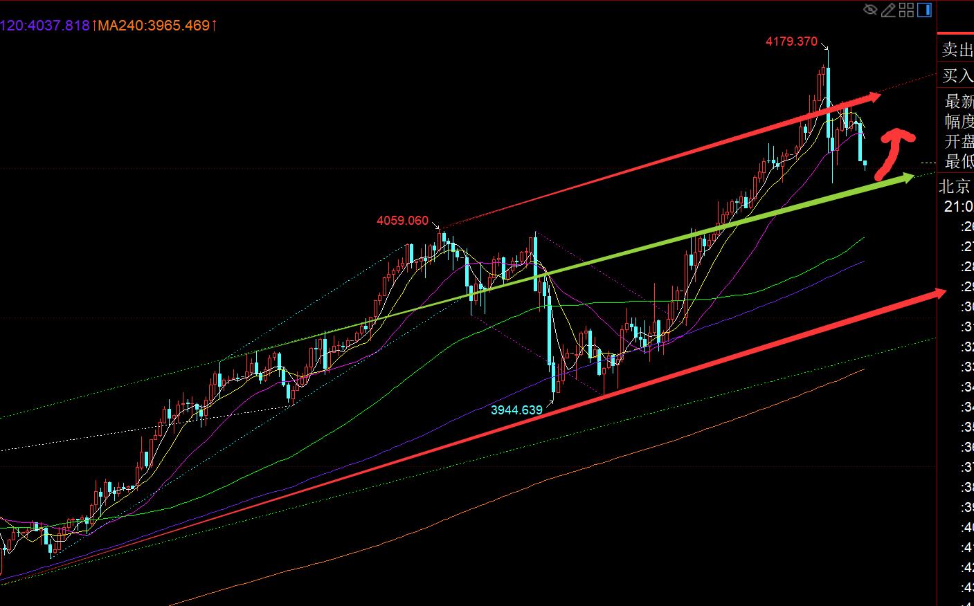 第二,黃金小時線級別:午後壓制4179一線跳水一波至4090,也是昨夜凌晨低點,雙底企穩後,歐盤反彈一波至4145,測試了跌幅618分割阻力,也是圖中紅色通道反壓點;而原本歐盤認為,反彈又重新站上了中軌,且整個歐盤處於反彈,並未延續午後走弱,那麼整體還是有些偏強,存在突破4045阻力的概率,然後壓制日內高點下再衝高回落,類似10月9日走法;結果實際走勢並未如此,而是選擇再次打壓,失守中軌,跌至4100;那麼當前布林帶走的就是縮口整理了,下方支撐4090一線比較關鍵,上方中軌4124阻力,以及紅色通道反壓點4150,因此留意4090-4150這個範圍內整理;個人不認為會再失守日內低點去直接試探日線5均線,若是如此,就等明日亞盤企穩找低位去看漲即可;